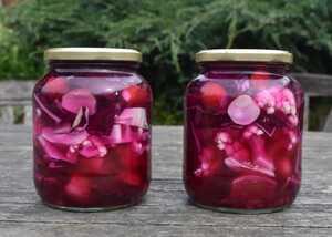 You can use many different types of vegetables to make these pickles, for example green cabbage, beetroot, radish or onions. Whether you copy them finely, slice them or leav them chunky is entirely up to you. Serve as a side-dish or enjoy as a snack.