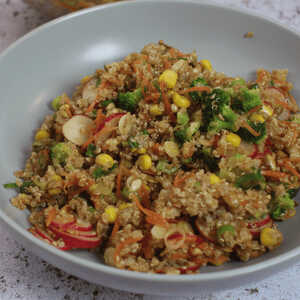 Cook the quinoa in 1.5 cups of water with a pinch of salt. Bring to a boil and simmer for 20 minutes. If there is still liquid left after this, remove the lid and simmer for 5 more minutes. Transfer to a bowl and allow to cool. Then prepare the vegetables. Blanch the broccoli, grate the carrot, slice the radishes and spring onion. Toast the nuts. Mix it all together into a bowl. Add in the sweetcorn & the pumpkin seeds. Then mix all the dressing ingredients together. Pour over the salad and mix well.