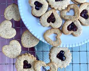 - Once cooled, spread a little jam on the whole biscuits and top with the heart-cut biscuits, pressing gently so the jam fills the opening.